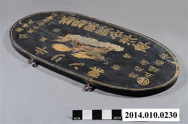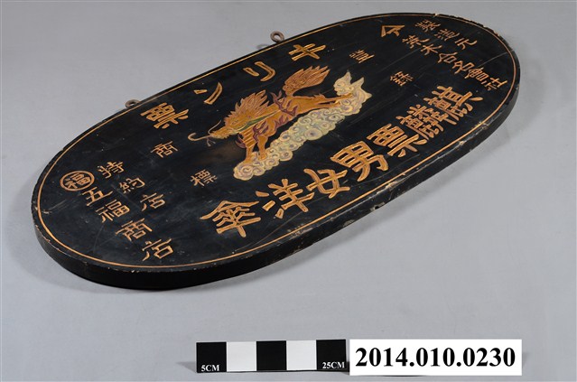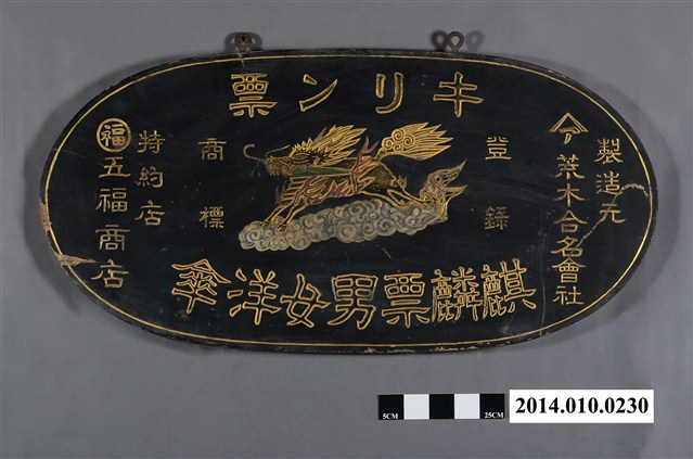本件為臺南五福商店販賣麒麟票男女洋傘招牌,招牌除販售商店及產品的名稱之外,另寫有:「製造元 荒木合名繪社」,做為日本時代百貨業的見證史料,反映大眾生活的歷史樣貌。