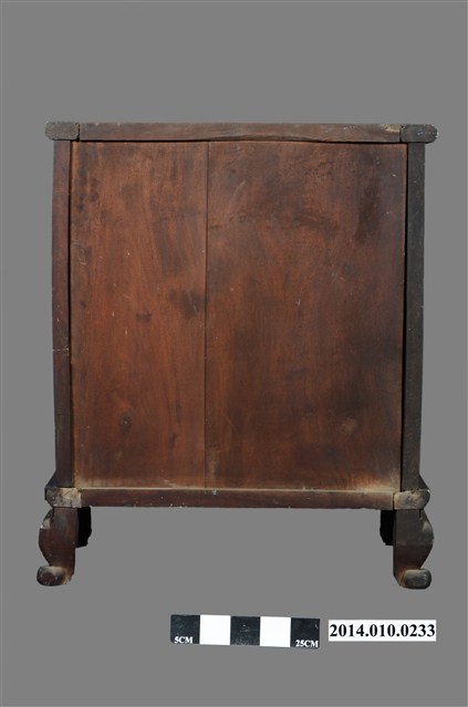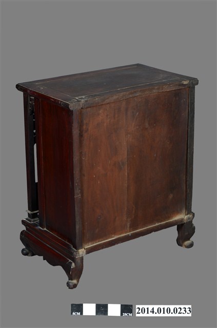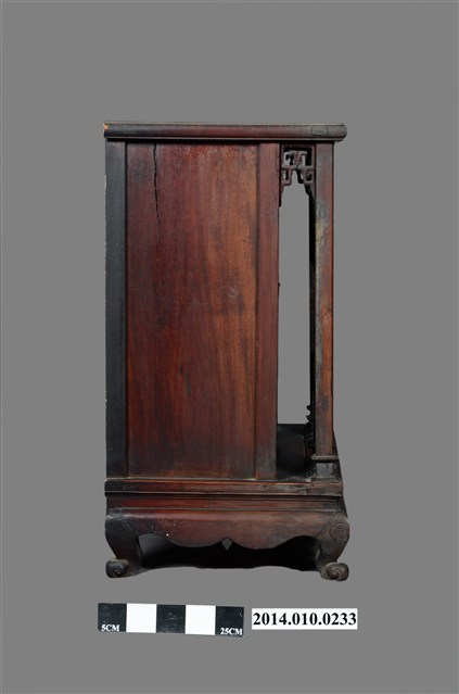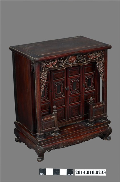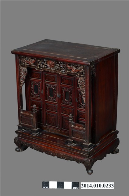 為木製神龕,門板可折,往內開,內無放置神像,「茄冬入石榴」是傳統小木作的鑲嵌技法,是台南府城的文化特色,亦是台灣傳統家具代表性的工藝,利用兩種木頭不同深淺的顏色的鑲嵌手法,以深色底與淺色圖案彼此製作出的效果十分鮮明,因製作技術困難,費時費工。本件無具體的時間和使用者脈絡,據收藏家洪輝龍所述,為台南地區物件,時間則在日治或之前。