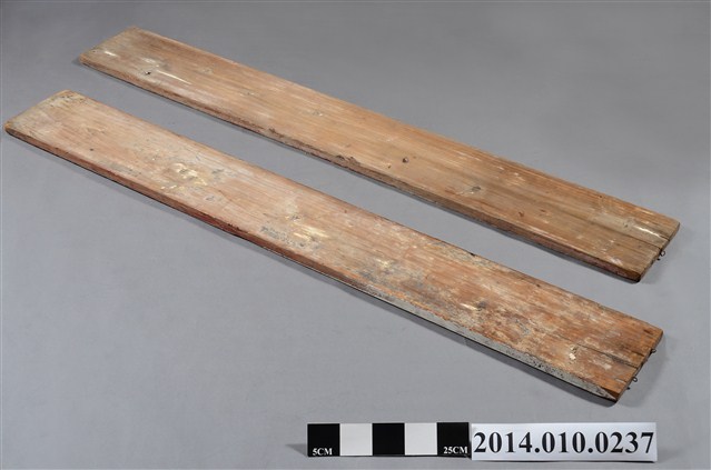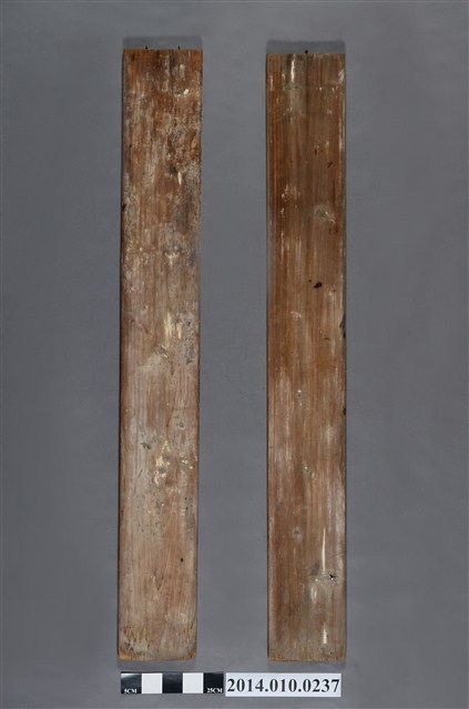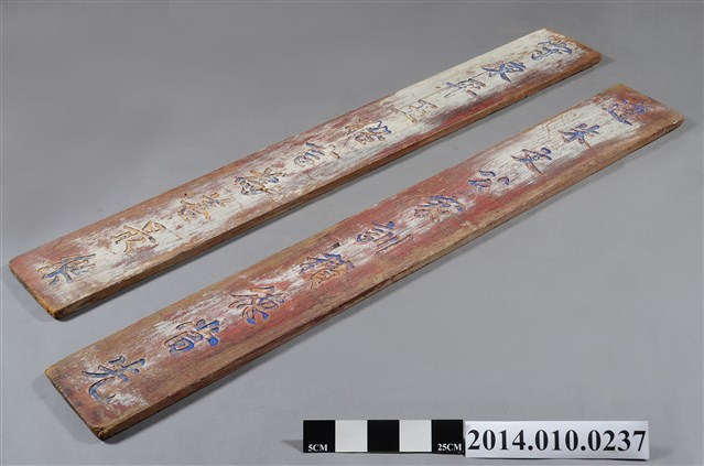 為台南神農街私宅對聯,上聯文字為:「守東平王格言為善最樂」;下聯為:「遵朱文公家訓積德當先」。東平王為東漢劉蒼,朱文公為明代朱熹。此一對聯常見的下聯為:「遵司馬公家訓積德當先」,推測應為受儒家文化浸染甚深的自家對聯。據收藏家洪輝龍所述,此為道光年間物件。