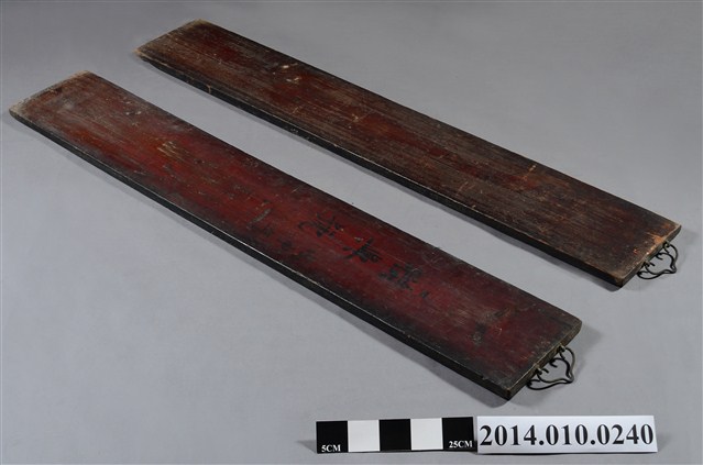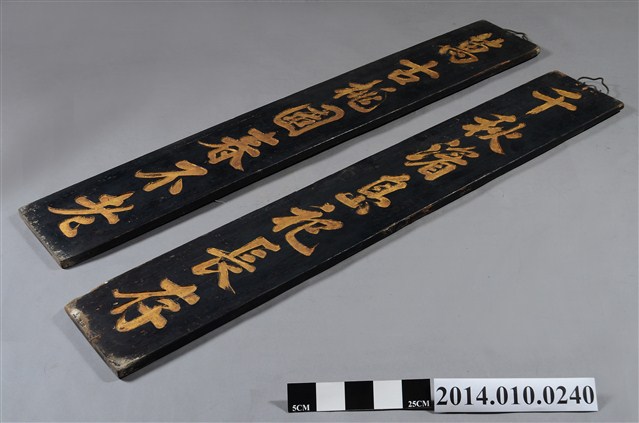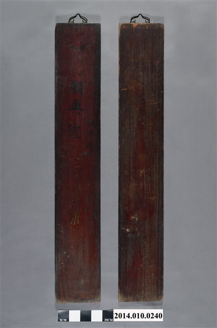 為清代文物,據收藏家所述,為台南三郊(「北郊」、「南郊」及「糖郊」)之一的商家,聯興號的張貼對聯。對聯內容為,上聯:「萬古桃園春不老」;下聯:「千秋湄島祈長存」。