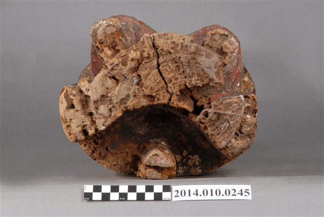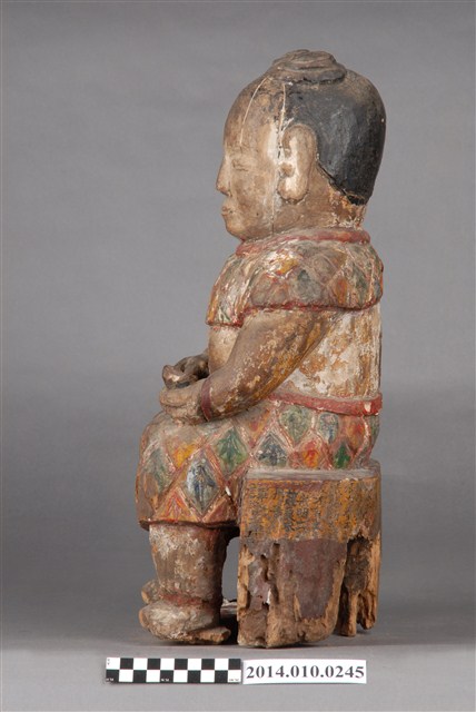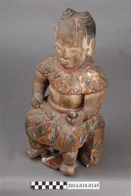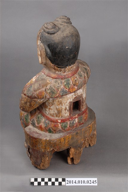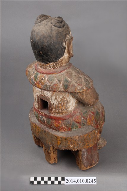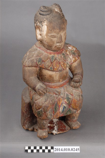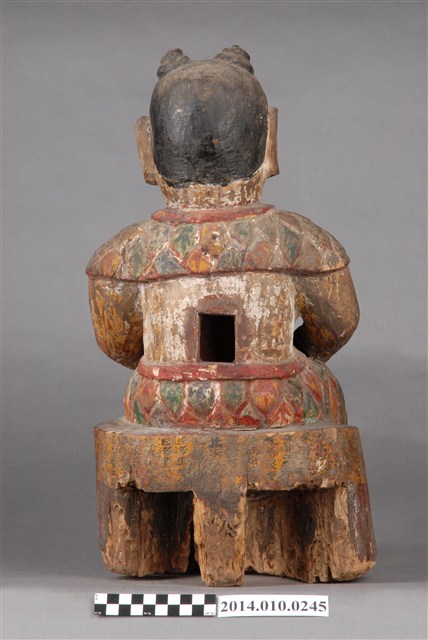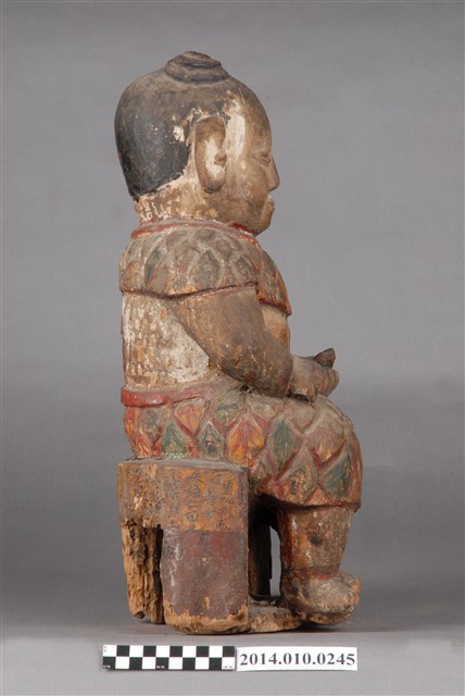 木刻的神農大帝神像,呈坐姿,有披肩,袒露腹部,左手持有不知名物件。據收藏家洪輝龍所述,為清代的神像。缺乏具體的時間及使用者脈絡。