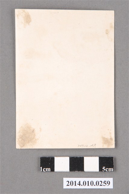 1. 本件是孩童獨照,是一張以兒童全身像為主題的攝影照片,黑白照片,採直式版面拍攝。照片中,1名兒童站立在照片中央,兩眼看著攝影鏡頭,雙手垂放在大腿兩側。孩童的服裝素簡,身穿淺素色的圓領無袖背心與短褲,以及腳踝帶有綁帶的船型童鞋。照片的背景位於室內,男童背後為素面牆壁,襯出所踏之地為帶有花紋的瓷磚;畫面構圖上,地面佔畫面約3分之1,牆面佔3分之2。地面瓷磚約有3種樣式,分別是菱形幾何圖案、4瓣花卉、與8角放射狀幾何圖形,排列方式為菱形、花卉交錯成1排,菱形、放射狀圖形交錯成1排,兩者再交錯排列。2.日治時期,近代攝影技術隨著日本的統治傳入臺灣,各地開始出現寫真館,官方也監製、出版為數不少的寫真帖,攝影師大部分為日本人,攝影的種類包含政治軍事、自然風景與人文風俗等;而一般臺灣人開設的寫真館,主要以拍攝個人肖像照、家庭式合照、或外拍寫真等等。此時也出現臺灣籍攝影名師,即具有「攝影三劍客」之名的張才、鄧南光與李鳴鵰。第二次世界大戰後,中華民國政府遷臺,過去的寫真館改稱為照相館、攝影館,承續過去拍攝人像照之主要項目持續營業。此外,隨著家庭經濟逐漸足以承擔相機設備,照相機逐漸普及於一般家庭,無論是日常出遊或婚禮節慶,留影紀念也日漸成為習慣,其中更不乏孩童的成長紀錄,亦有不少照片以孩童為主,作為孩子的成長紀錄。