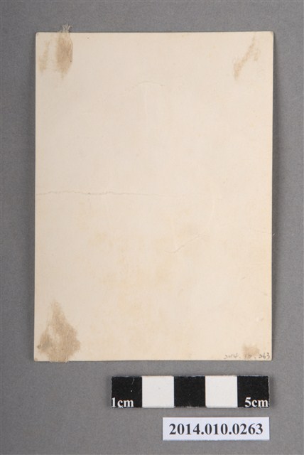 1.坐在沙發椅上的孩童,是一張以孩童全身像為主題的攝影照片,黑白照片,以直式版面拍攝。照片中,1名孩童坐在沙發椅上看向鏡頭,椅子有靠背,靠背呈三角形,沙發椅外罩格紋布套,椅子上並掛著條紋圖案的毯子。孩童坐在沙發中間,在構圖上佔據畫面大部分版幅,背景簡單,為素色之牆面。孩童穿著圓翻領格紋短袖嬰兒連身衣,頭髮因年齡稚嫩而十分細短,臉形圓潤,眼睛渾圓有神,表情或因好奇鏡頭外的拍攝者而眉頭微皺,嘴唇微張,張開雙腿,兩手垂放靠在小腿上。孩童未穿鞋,光著腳,其中一腳腳底靠在沙發邊緣,腳趾懸空,一腳全放在沙發上,左腳腳指前伸。2.日治時期,近代攝影技術傳入臺灣,各地開始出現寫真館,官方也監製、出版為數不少的寫真帖,攝影師大部分為日本人,攝影的種類包含政治軍事、自然風景與人文風俗等;此時也出現臺灣籍攝影名師,即具有「攝影三劍客」之名的張才、鄧南光與李鳴鵰,而一般臺灣人開設的寫真館,主要以拍攝個人肖像照、家庭式合照、或外拍寫真等等。與此同時,大眾文化興起,也提高了大眾對影像的需求與接受度,而家庭的觀念以及現代教育也強調了兒童的重要性,促使家庭為孩童的成長留下影像紀錄。綜合幾種因素,使進入20世紀以後,以孩童為主題的照片大量增加,本件照片即屬之。