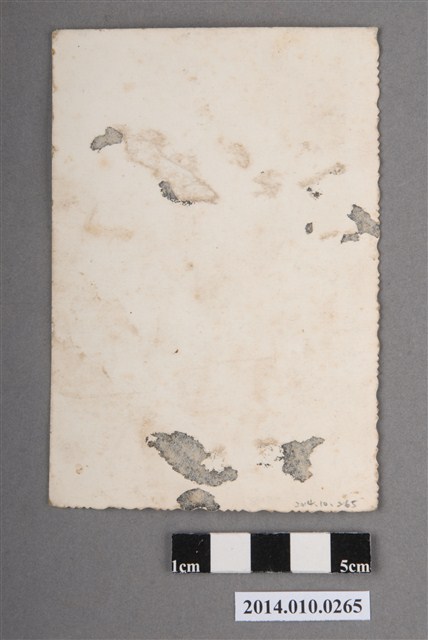 1.女童敬禮姿勢個人照,是一張以女童全身像為主題的攝影照片,黑白照片,以直式版面拍攝。照片中,1名女童位在畫面中央,在姿勢與表情上,兩手提著裙襬,右腳在前,左腳在後,微微側身,雙眼看向畫面右方遠處,表情微笑,展現優雅的姿態。服裝打扮方面,女童留有長度至耳邊的短髮,髮尾外捲,顯得十分俏麗,身穿翻領無袖的短洋裝,領口繫著蝴蝶結,腰間兩側裝飾口袋,腳穿橫條紋、長度至腳踝的短襪,以及低跟、圓頭造型的瑪莉珍鞋。女孩照片背景位在室內,背景之地板為方格、三角形之幾何圖案排列的織紋地毯,牆面則素面紋樣,但左側邊緣有花草剪影之裝飾。2.日治時期,近代攝影技術傳入臺灣,各地開始出現寫真館,官方也監製、出版為數不少的寫真帖,攝影師大部分為日本人,攝影的種類包含政治軍事、自然風景與人文風俗等;而一般臺灣人開設的寫真館,主要以拍攝個人肖像照、家庭式合照、或外拍寫真等等。此時也出現臺灣籍攝影名師,即具有「攝影三劍客」之名的張才、鄧南光與李鳴鵰。第二次世界大戰後,中華民國政府遷臺,過去的寫真館改稱為照相館、攝影館,承續過去拍攝人像照之主要項目持續營業。此外,隨著家庭經濟逐漸足以承擔相機設備,照相機逐漸普及於一般家庭,無論是日常出遊或婚禮節慶,留影紀念也日漸成為習慣,亦有不少照片以孩童為主,作為孩子的成長紀錄。本件照片的由其拍攝場景與孩童的姿勢、光影技巧等元素,推測是在照相館中拍攝。