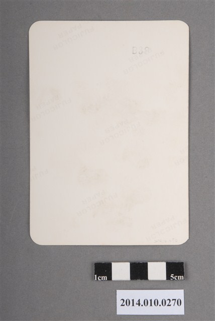 1.本件是襁葆中的幼兒,彩色攝影照片,採直向版面拍攝,相紙四角經過圓角修飾,相紙背面有「B38」之印章註記。照片主題為嬰兒日常生活紀錄,照片中的幼兒全身包裹於黃、紅2色組成圖案的棉被之中,棉被折成信封形狀,開口呈三角形,幼兒由此開口露出臉龐。幼兒呈仰躺姿勢,雙頰圓潤,眉毛濃密,嘴唇微啟,短密而細緻的頭髮因平躺而向頭頂與兩側散開,兩眼水潤,表情好奇地看著鏡頭。嬰兒平躺於一座搖籃之中,照片左側有一長竿貫穿照片畫面,為搖籃的上緣,畫面左上角可見到搖籃部分的組成結構與零件,右方的粉底菱花紋布面則為搖籃的內部。照片拍攝之地點,由畫面左上角顯露出的磨石子地面來看,推測處於建築之居室內或騎樓等空間之中。2.臺灣早期的搖籃多以容易取得的竹篾或籐片編織製成,形狀為中空立體形,有些四周固定繩索,可用於懸吊在屋樑上,有些則附有搖架,可將搖籃固定在架上,防止幼兒跌出。搖籃內部舖設軟墊或棉被,讓嬰兒能躺於其中安靜休息與睡眠。早期臺灣農家會將尚未學步爬動的幼兒放在搖籃之中,以空出雙手從事更多家務工作。