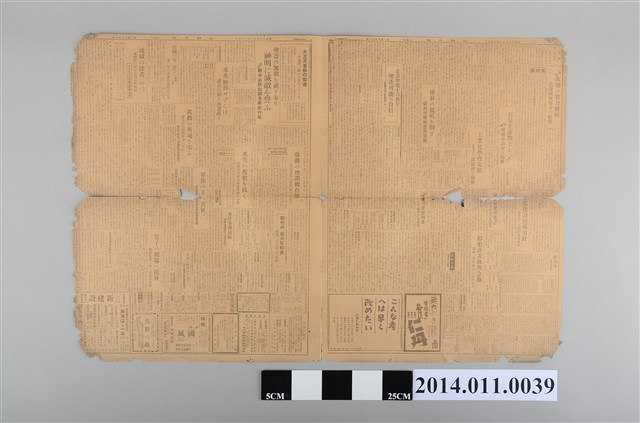 2.《臺灣日報》,前身為日本時代在臺南創立之《臺南新報》,《臺南新報》1899年由富地近思創辦,與《臺灣日日新報》、《臺灣新聞》並稱為日治時期臺灣三大官報,與《臺灣日日新報》相比《臺南新報》屬於地方報紙,其報導內容雖仍有世界、日本及臺灣各地消息,但比較他報相比專注於南部消息,且內容較為活潑,對於南部的經濟、米、糖報導較為精確,1937年4月中日戰事將起,日本當局下令所有報刊停止漢文欄,《臺南新報》更名為《臺灣日報》。1944年3月又與《臺灣日日新報》、《臺灣新聞》、《興南新聞》、《東臺灣新報》、《高雄新報》6家日報同遭廢刊,而後齊併為《臺灣新報》刊行。由報導內容看來,戰爭消息已成為主要篇幅,且可能受戰事影響,物資缺乏,刊載篇幅已從8面縮減至1面。昭和18年(1943)12月25日。