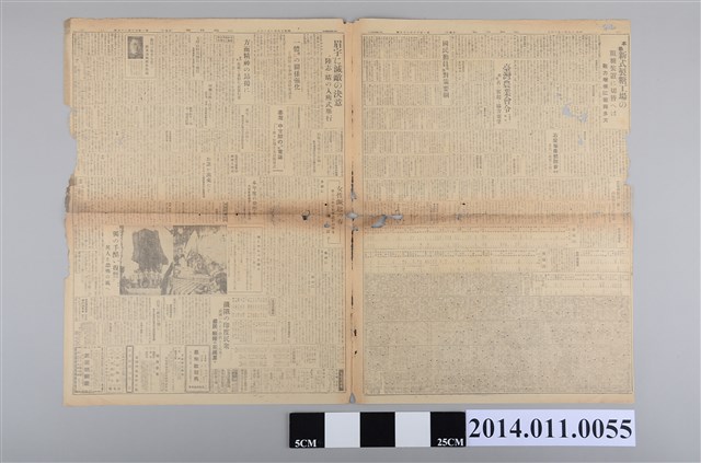 2.《臺灣日報》,前身為日本時代在臺南創立之《臺南新報》,《臺南新報》1899年由富地近思創辦,與《臺灣日日新報》、《臺灣新聞》並稱為日治時期臺灣三大官報,與《臺灣日日新報》相比《臺南新報》屬於地方報紙,其報導內容雖仍有世界、日本及臺灣各地消息,但比較他報相比專注於南部消息,且內容較為活潑,對於南部的經濟、米、糖報導較為精確,1937年4月中日戰事將起,日本當局下令所有報刊停止漢文欄,《臺南新報》更名為《臺灣日報》。1944年3月又與《臺灣日日新報》、《臺灣新聞》、《興南新聞》、《東臺灣新報》、《高雄新報》6家日報同遭廢刊,而後齊併為《臺灣新報》刊行。由報導內容看來,戰爭消息已成為主要篇幅,且可能受戰事影響,物資缺乏,刊載篇幅已從8面縮減至1面。昭和19年(1944)1月14日。