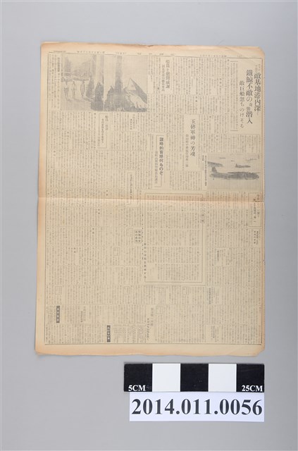 2.《臺灣日報》,前身為日本時代在臺南創立之《臺南新報》,《臺南新報》1899年由富地近思創辦,與《臺灣日日新報》、《臺灣新聞》並稱為日治時期臺灣三大官報,與《臺灣日日新報》相比《臺南新報》屬於地方報紙,其報導內容雖仍有世界、日本及臺灣各地消息,但比較他報相比專注於南部消息,且內容較為活潑,對於南部的經濟、米、糖報導較為精確,1937年4月中日戰事將起,日本當局下令所有報刊停止漢文欄,《臺南新報》更名為《臺灣日報》。1944年3月又與《臺灣日日新報》、《臺灣新聞》、《興南新聞》、《東臺灣新報》、《高雄新報》6家日報同遭廢刊,而後齊併為《臺灣新報》刊行。由報導內容看來,戰爭消息已成為主要篇幅,且可能受戰事影響,物資缺乏,刊載篇幅已從8面縮減至1面。昭和19年(1944)1月14日。