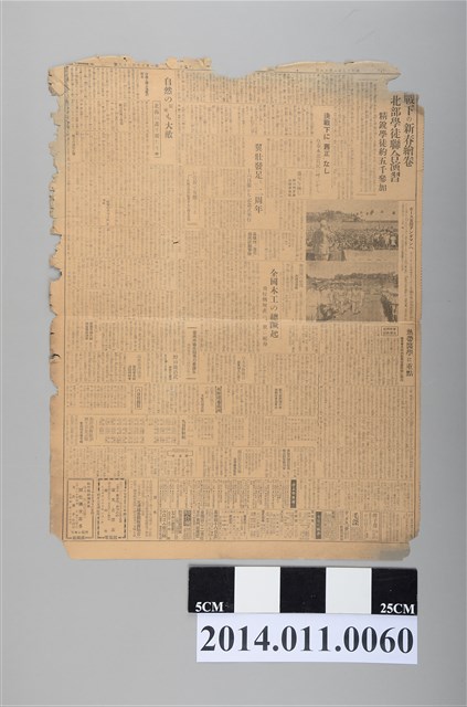 2.《臺灣日報》,前身為日本時代在臺南創立之《臺南新報》,《臺南新報》1899年由富地近思創辦,與《臺灣日日新報》、《臺灣新聞》並稱為日治時期臺灣三大官報,與《臺灣日日新報》相比《臺南新報》屬於地方報紙,其報導內容雖仍有世界、日本及臺灣各地消息,但比較他報相比專注於南部消息,且內容較為活潑,對於南部的經濟、米、糖報導較為精確,1937年4月中日戰事將起,日本當局下令所有報刊停止漢文欄,《臺南新報》更名為《臺灣日報》。1944年3月又與《臺灣日日新報》、《臺灣新聞》、《興南新聞》、《東臺灣新報》、《高雄新報》6家日報同遭廢刊,而後齊併為《臺灣新報》刊行。由報導內容看來,戰爭消息已成為主要篇幅,且可能受戰事影響,物資缺乏,刊載篇幅已從8面縮減至1面。昭和19年(1944)1月17日。