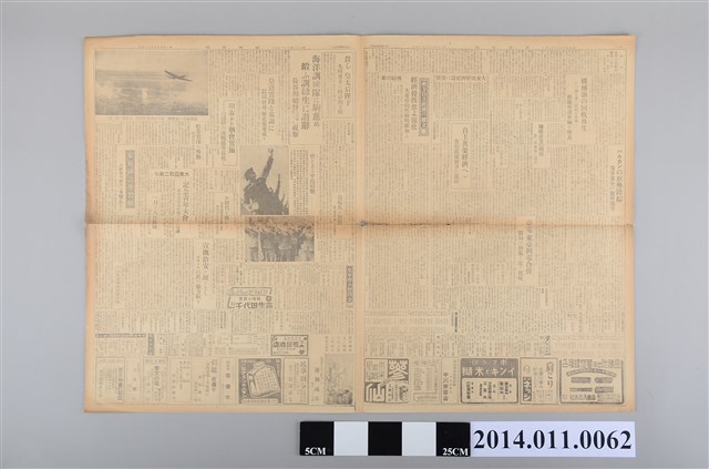 1.標題:1943年12月18日。第三年に期待さる新銳潛艦戰の威力、竸馬一時停止に決定、英米蔣軍の??深刻、興亞精神を徹底せよ、米軍開戰以來の損害十三萬又も實數は???、戰爭理念に敵破るスマツツ演說で暴露、全米鐵道員總罷業、餓死者一萬五千、百萬人の印度餓死、在支米機の敗戰、生計費百六十倍、獨機パリ港を猛攻、赤軍の損害一萬五千。廣告:オナールア衛生口錠、香水原料オリ?ナル、人生醫院(彰化)、林齒科醫院、臺中產婆講習所、木下親古唐、宮本大賣商店、乳酸菌。