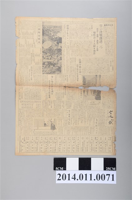 1.標題:1944年1月15日。航空站刻一刻苛烈化、マカアサルにも來襲、八機中六機を擊墜、男子の就業禁止實施、郵貯利子引下決定、大東亞宣言を推進する、防空訓練を一層強化、全支に先制討伐續行、太平洋世界の建設、米陸海の損害十四萬、獨蘇冬季戰最高潮、威脅日本の戰力、戰車二千を擊破、戰車旅團を殲滅、台中話題。