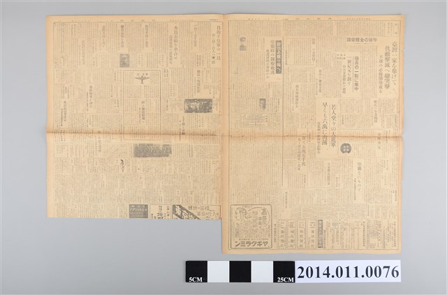 1. 本文件為昭和18年(1943)12月3日興南新聞臺灣本社發行之《興南新聞第4628號》第一頁,當時正值太平洋戰爭時期,報紙內容提及陸軍省褒揚在春季江北殲滅作戰有功的中畑部隊笹本中隊以及梅木部隊的飛田小隊,並描述笹本中隊及飛田小隊在這場戰役中的戰鬥過程。此外,文中也有報導皇奉全體會議午後の答申,內容記載會議中委員的答辯。另外,本期探討的主題尚有:中國常德會戰的激烈戰況、黃河下游地帶日本軍隊奮勇作戰的情形、日本空軍在香港上空與敵軍追擊的奮戰過程、日本病院船遭不法襲擊等議題。大致上來看,本期報導的內容主要是在談論日本在戰爭中的戰況,以及日本政府所執行的政策等。