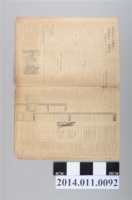 1.本文件為昭和19年(1944)1月10日興南新聞臺灣本社發行之《興南新聞第4665號》第一頁,當時正值太平洋戰爭時期,報紙內容提及中國參戰一周年紀念日:共同的理想巨步、走狗重慶側的叛逆。另外,本期探討的主題尚有:張國務總理放送共同宣揚的理念、陸海軍的周間戰況、共同的敵人米英的擊墜、東亞解放戰完遂、萬全的議會準備進步:政府兩院相呼應。大致上來看,本期報導的內容主要是在談論日本與其在中國所建立的政府兩者間共同的理念,以及在國際的戰況。