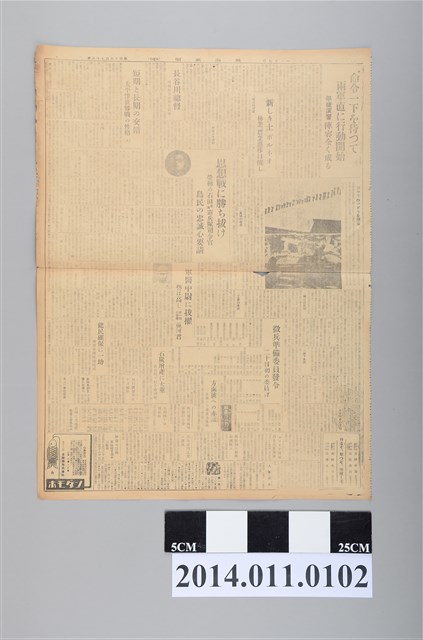 1.本文件為昭和19年(1944)1月17日興南新聞臺灣本社發行之《興南新聞夕刊第4672號》第一頁,當時正值太平洋戰爭時期,報紙內容提及機械化國防協會的運動目標:機甲思想普及,以及軍需社會法基指定共一百五十社。另外,本期探討的主題尚有:產報運動的強化、憲兵隊司令官更迭、世界戰局的展望(下)、國際展望、百五十社を指定、翼狀運動的五目標、第二號海防艦進水式、留學生入學銓衡。大致上來看,本期的內容主要是在探討日本國內的行政及法律,以及世界戰局的展望。