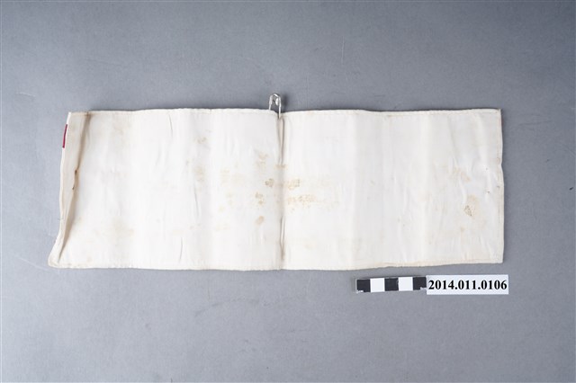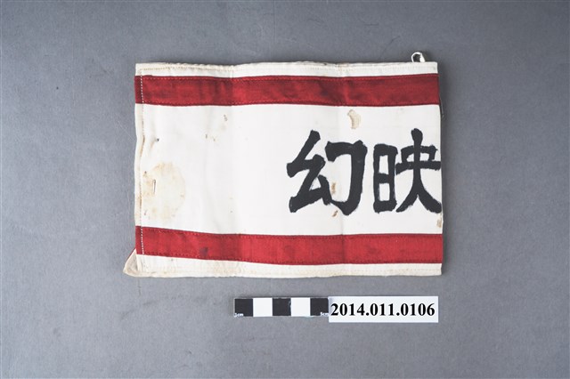 1.本文物為日治時期幻映文化協會的臂章,為白底上下縫有紅色布條作為裝飾,且中間用毛筆寫有「幻映文化協會」六大字的臂章,材質應為麻布,臂章寬度約為一小圓筒寬。臂章左側有一灘污漬,臂章他處的白布也有些剝落。
