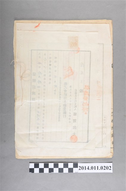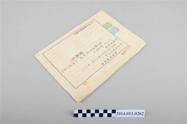 1. 本文物為大正7年(1918)10月14日第三九四九號借用金領收證,其性質與金錢相關,領收證人為新竹廳苗栗一堡公館庄四五七番地鐘鳳生,金額為一金一千二百元,記有株式會社日本勸業銀行御中,內容附有印鑑證明願於大正7年9月20日蓋有鍾鳳生之印章,金額借用證則記有其向株式會社台灣銀行借用一百七十八圓八十二錢,另外於土地表示的附件中賣渡人的土地位於苗栗一堡公館庄一番有一田一甲三分二厘九毛,並於相關文件最後有株式會社日本勸業銀行總裁志村源太郎,最後附有債權消滅證,而領收事項怕口說無憑,因此留有此文書為據。