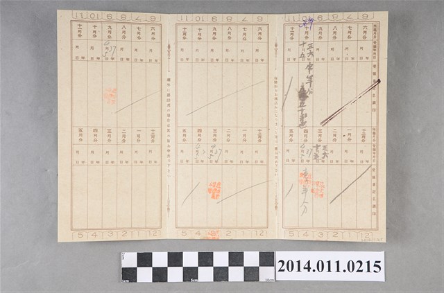 1. 本文物為三三三二九四番號保險金領收帳,有付款日期、證書作成日、付款方法、被保險者氏名、契約者氏名等幾個欄位,其中契約者氏名為張捷明,證書作成日為30日,保科金額為1.00,內寫有保險相關法規、保險公司規則等注意事項,並蓋有相關單位的戳章,但付款合併表格登記之處為空白,背面表格有詳細記錄保險所屬月份、受領月日、受領者記名等資訊,表格中所紀錄之時間多為明治36年。