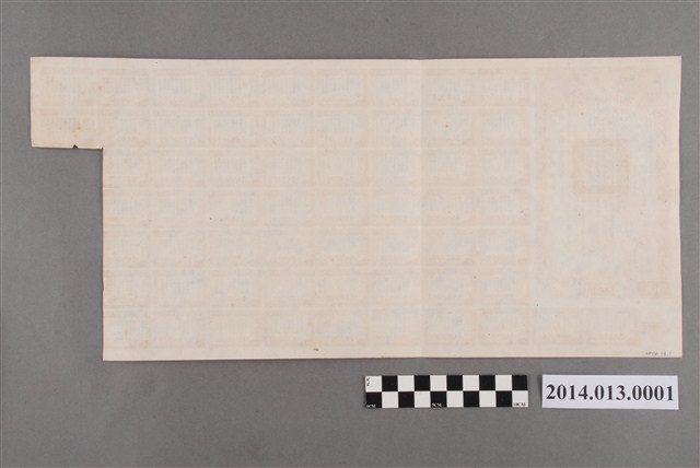 1.此文物為民國三十三年同盟勝利公債券,有債票跟息票,息票為給付利息用。本公債為五百圓面額,號碼為1683082。五百圓的息票為每張15圓,半年付息一次,本張僅支付至第5張,即1946(民國40)年12月31日為止,原因不明,因《民國三十三年同盟勝利公債條例》於1951(民國40)年11月20日連同眾多公債條例一律廢止。從此只剩下觀賞保存價值。故本張債券有原本債票及息票(6-65號,原最後給付時間應為1976年12月31日)債票上有條例摘要,並有發行日期民國33年(1944)7月1日,並有當時財政部長孔祥熙,兩位次長俞鴻鈞、顧翊羣簽名及印章。 2.以同盟勝利名義之公債條例先後有《民國三十一年同盟勝利公債條例》,《民國三十二年同盟勝利公債條例》,《民國三十三年同盟勝利公債條例》。都在前述廢止條例時一律廢止。 3.《民國三十三年同盟勝利公債條例》共有十條,於1944年7月5日公布。(1)國民政府為平衡預算,穩定物價,健全金融,吸收游資,以達到民主同盟國家之勝利,發行公債,定名為民國三十三年同盟勝利公債。(2)本公債定額為國幣五十億元,於民國三十三年七月一日按照票面額十足發行。(3)本公債利率訂為年息六釐,每六個月付息一次。(4)本公債自民國三十六年六月底起開始還本,三十年還清,每六個月抽籤還本一次,每次償還數目,依還本付息表之規定。(5)本公債應付本息由國庫收入項下,按期撥交中央銀行存儲備付。(6)本公債還本付息指定中央銀行及其委託銀行為經理機關。(7)本公債債票分為十萬元、五萬元、一萬元、五千元、五百元、二百元七種,均為無記名式。(8)本公債債票得自由買賣抵押,凡公務上須繳納保證金時,得作為替代品,並得為銀行之保證準備金。(9)對於本公債有偽造或毀損信用之行為者,由司法機關依法懲治。(10)本條例自公布日施行。 4.由於此債票有等同貨幣之價值,得自由買賣抵押,且採無記名方式,可能因此原因而於戰後自然流入臺灣,惟不知在臺灣如何兌換,因為原記名為國幣,臺灣在1949年後也重新發行新臺幣,尚待研究。參考文獻: 1.民国三十三年同盟胜利公债条例,信都书店古籍书画晾晒处,http://blog.sina.com.cn/s/blog_6c99056501013bu4.html(瀏覽日期:2013/02/01)。 2.蔣中正,1951/11/20。總統令,總統府公報。臺北:總統府。