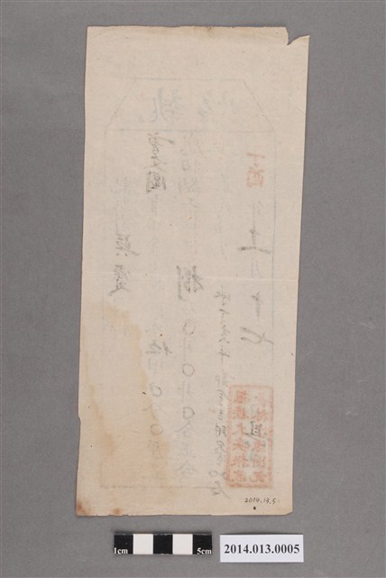 為擺接大安粮陂長林進源發給吳寶官耕曹文圖官田,因食大安陂水伍甲而抽納工資粟捌石的執照(證明)。註記有「具」單及「承丁亥年鄭金聲欠金20石」。另有「擺接大安粮陂長林進源」印。