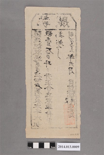 為竹北一保東興庄陂長林礽浪發給蔴圓庄佃戶劉阿欽繳納水租穀壹石的執照(證明)。