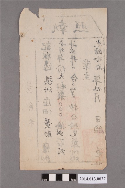 為擺接社番業主李金水給溪州庄佃戶黃助,繳納該年大租粟貳石貳斗貳升的執照(證明)。另有二方「擺接社番業主李金水圖記」。