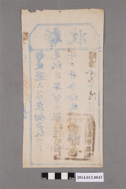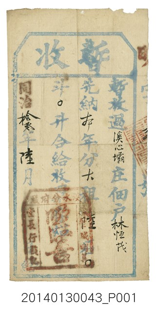 為明善堂給溪心壩庄佃戶林恒茂先納本年分大租陸石的暫收單。另有一方「淡水分府發 給塹城明善堂長行戳記」印與一方騎縫章。(同治六年, 臺灣府淡水撫民同知嚴金清提倡捐銀,於塹城、艋舺二處各設明善堂為義倉。竹塹義倉購金姓屋改造,並附義塾)