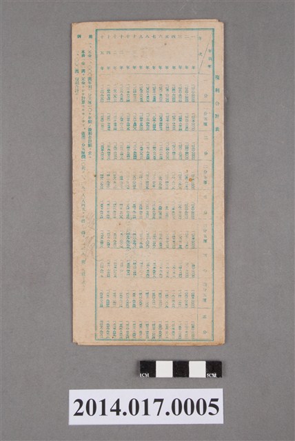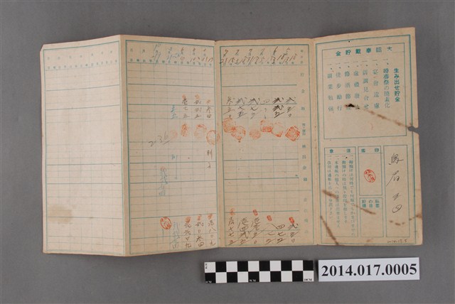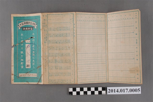 地址登載為烏眉34。本物件為戰爭期間1943年~1945年期間後龍、公司寮、水尾子、二張犁、大山腳、頭湖、崎頂等地人民之銷帳儲金簿,內頁印有大詔奉戴字樣,並以婚葬儀式簡化、宴會遠慮、新謁見合せ、虛禮廢止、節酒節煙、徒步勵行、副業勉強倡導儲金,另外印有儲簿規定如:不許轉讓、改印需申請等,背頁附有複利合計表。大詔指的是1941年對美、英兩國之宣戰詔書,1942年起每個月8日定為大詔奉戴日,為日本政府為太平洋戰爭所運作的國民運動,隨著戰爭規模擴大,戰時有各項國民強迫儲蓄的舉措,以支援前線戰事,1938年日本政府為因應中日戰爭即推行有愛國儲蓄運動,本物件則為1942年後因應戰爭規模擴大後之儲蓄項目,范雅鈞指出本儲金簿為強制存款,直接由薪資扣除。