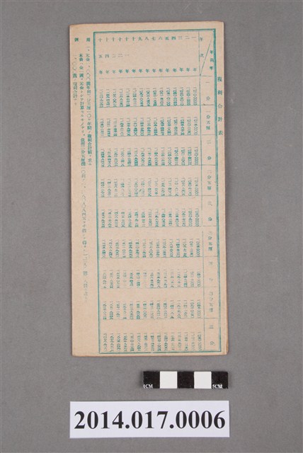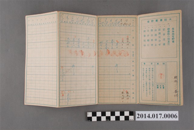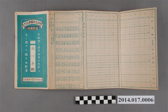 地址登載為頭湖111番地。本物件為戰爭期間1943年~1945年期間後龍、公司寮、水尾子、二張犁、大山腳、頭湖、崎頂等地人民之銷帳儲金簿,內頁印有大詔奉戴字樣,並以婚葬儀式簡化、宴會遠慮、新謁見合せ、虛禮廢止、節酒節煙、徒步勵行、副業勉強倡導儲金,另外印有儲簿規定如:不許轉讓、改印需申請等,背頁附有複利合計表。大詔指的是1941年對美、英兩國之宣戰詔書,1942年起每個月8日定為大詔奉戴日,為日本政府為太平洋戰爭所運作的國民運動,隨著戰爭規模擴大,戰時有各項國民強迫儲蓄的舉措,以支援前線戰事,1938年日本政府為因應中日戰爭即推行有愛國儲蓄運動,本物件則為1942年後因應戰爭規模擴大後之儲蓄項目,范雅鈞指出本儲金簿為強制存款,直接由薪資扣除。