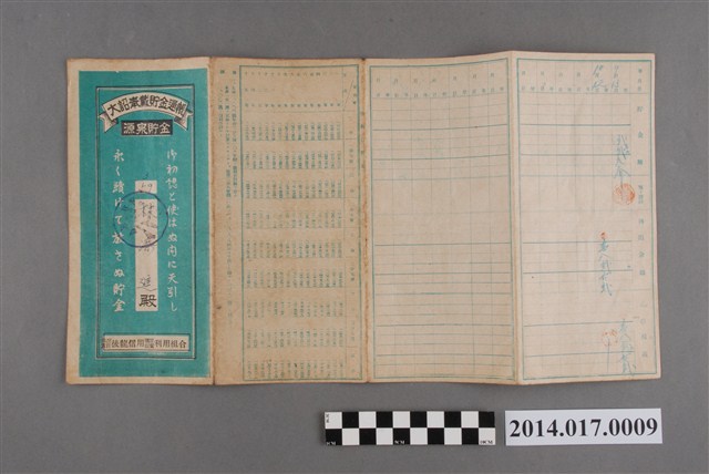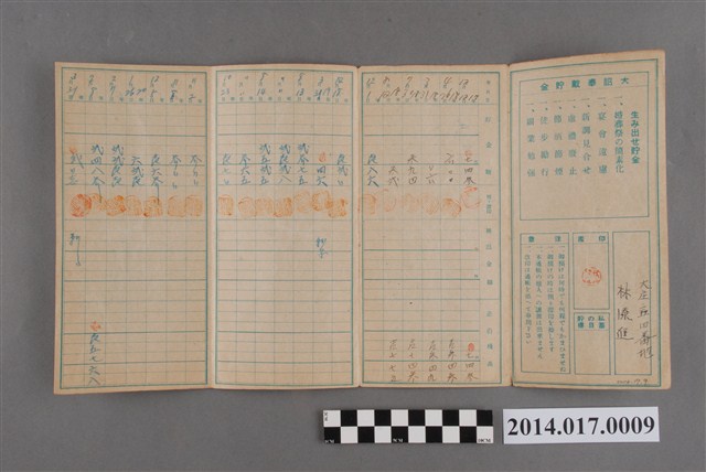 地址登載為大庄154番地。本物件為戰爭期間1943年~1945年期間後龍、公司寮、水尾子、二張犁、大山腳、頭湖、崎頂等地人民之銷帳儲金簿,內頁印有大詔奉戴字樣,並以婚葬儀式簡化、宴會遠慮、新謁見合せ、虛禮廢止、節酒節煙、徒步勵行、副業勉強倡導儲金,另外印有儲簿規定如:不許轉讓、改印需申請等,背頁附有複利合計表。大詔指的是1941年對美、英兩國之宣戰詔書,1942年起每個月8日定為大詔奉戴日,為日本政府為太平洋戰爭所運作的國民運動,隨著戰爭規模擴大,戰時有各項國民強迫儲蓄的舉措,以支援前線戰事,1938年日本政府為因應中日戰爭即推行有愛國儲蓄運動,本物件則為1942年後因應戰爭規模擴大後之儲蓄項目,范雅鈞指出本儲金簿為強制存款,直接由薪資扣除。