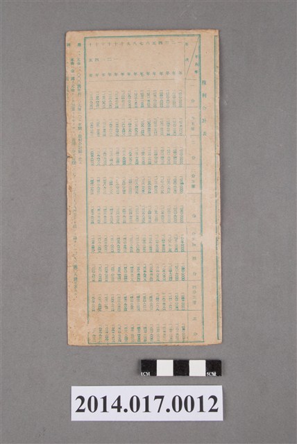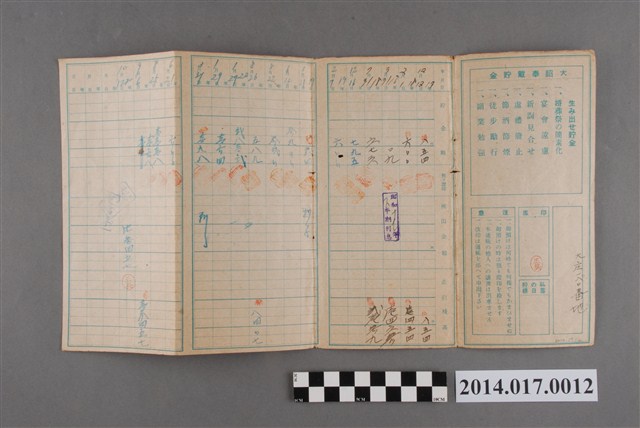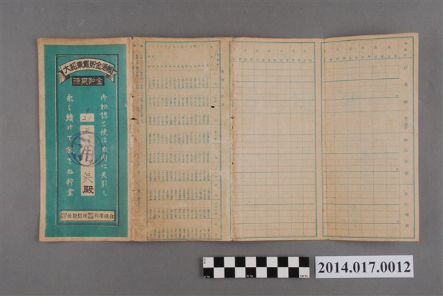 大庄180番地。本物件為戰爭期間1943年~1945年期間後龍、公司寮、水尾子、二張犁、大山腳、頭湖、崎頂等地人民之銷帳儲金簿,內頁印有大詔奉戴字樣,並以婚葬儀式簡化、宴會遠慮、新謁見合せ、虛禮廢止、節酒節煙、徒步勵行、副業勉強倡導儲金,另外印有儲簿規定如:不許轉讓、改印需申請等,背頁附有複利合計表。大詔指的是1941年對美、英兩國之宣戰詔書,1942年起每個月8日定為大詔奉戴日,為日本政府為太平洋戰爭所運作的國民運動,隨著戰爭規模擴大,戰時有各項國民強迫儲蓄的舉措,以支援前線戰事,1938年日本政府為因應中日戰爭即推行有愛國儲蓄運動,本物件則為1942年後因應戰爭規模擴大後之儲蓄項目,范雅鈞指出本儲金簿為強制存款,直接由薪資扣除。
