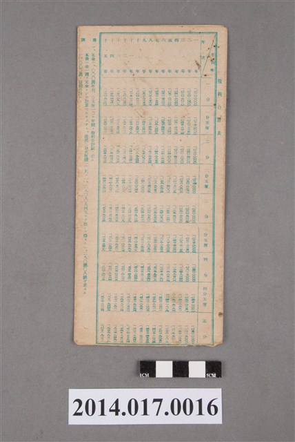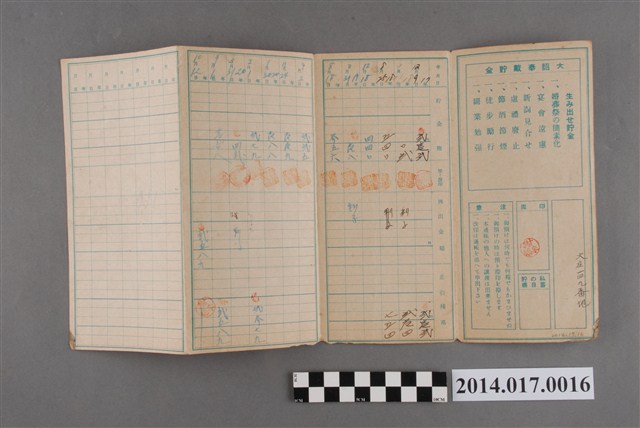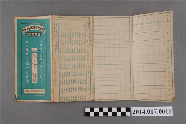 地址登載為大庄149番地。本物件為戰爭期間1943年~1945年期間後龍、公司寮、水尾子、二張犁、大山腳、頭湖、崎頂等地人民之銷帳儲金簿,內頁印有大詔奉戴字樣,並以婚葬儀式簡化、宴會遠慮、新謁見合せ、虛禮廢止、節酒節煙、徒步勵行、副業勉強倡導儲金,另外印有儲簿規定如:不許轉讓、改印需申請等,背頁附有複利合計表。大詔指的是1941年對美、英兩國之宣戰詔書,1942年起每個月8日定為大詔奉戴日,為日本政府為太平洋戰爭所運作的國民運動,隨著戰爭規模擴大,戰時有各項國民強迫儲蓄的舉措,以支援前線戰事,1938年日本政府為因應中日戰爭即推行有愛國儲蓄運動,本物件則為1942年後因應戰爭規模擴大後之儲蓄項目,范雅鈞指出本儲金簿為強制存款,直接由薪資扣除。
