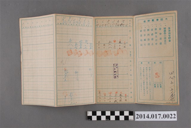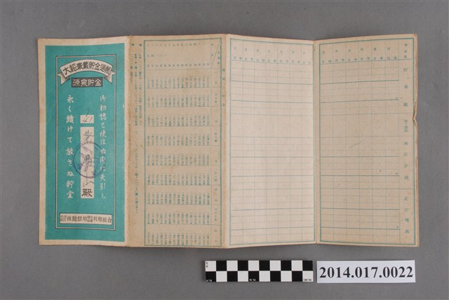 地址登載為田心子157番地。本物件為戰爭期間1943年~1945年期間後龍、公司寮、水尾子、二張犁、大山腳、頭湖、崎頂等地人民之銷帳儲金簿,內頁印有大詔奉戴字樣,並以婚葬儀式簡化、宴會遠慮、新謁見合せ、虛禮廢止、節酒節煙、徒步勵行、副業勉強倡導儲金,另外印有儲簿規定如:不許轉讓、改印需申請等,背頁附有複利合計表。大詔指的是1941年對美、英兩國之宣戰詔書,1942年起每個月8日定為大詔奉戴日,為日本政府為太平洋戰爭所運作的國民運動,隨著戰爭規模擴大,戰時有各項國民強迫儲蓄的舉措,以支援前線戰事,1938年日本政府為因應中日戰爭即推行有愛國儲蓄運動,本物件則為1942年後因應戰爭規模擴大後之儲蓄項目,范雅鈞指出本儲金簿為強制存款,直接由薪資扣除。