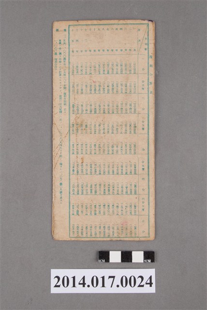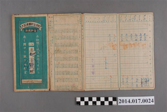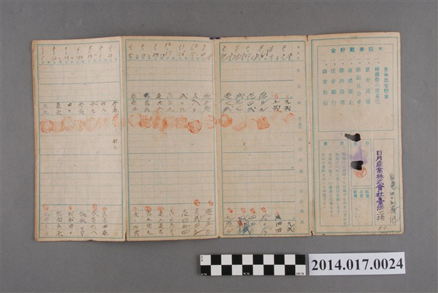 地址處印有日月產業株式會社工場,地址後龍405番地。本物件為戰爭期間1943年~1945年期間後龍、公司寮、水尾子、二張犁、大山腳、頭湖、崎頂等地人民之銷帳儲金簿,內頁印有大詔奉戴字樣,並以婚葬儀式簡化、宴會遠慮、新謁見合せ、虛禮廢止、節酒節煙、徒步勵行、副業勉強倡導儲金,另外印有儲簿規定如:不許轉讓、改印需申請等,背頁附有複利合計表。大詔指的是1941年對美、英兩國之宣戰詔書,1942年起每個月8日定為大詔奉戴日,為日本政府為太平洋戰爭所運作的國民運動,隨著戰爭規模擴大,戰時有各項國民強迫儲蓄的舉措,以支援前線戰事,1938年日本政府為因應中日戰爭即推行有愛國儲蓄運動,本物件則為1942年後因應戰爭規模擴大後之儲蓄項目,范雅鈞指出本儲金簿為強制存款,直接由薪資扣除。