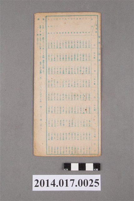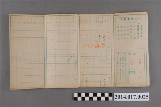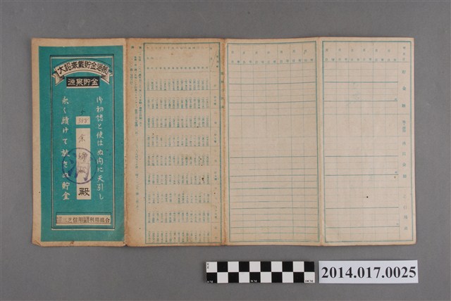 地址登載為二張犁301。本物件為戰爭期間1943年~1945年期間後龍、公司寮、水尾子、二張犁、大山腳、頭湖、崎頂等地人民之銷帳儲金簿,內頁印有大詔奉戴字樣,並以婚葬儀式簡化、宴會遠慮、新謁見合せ、虛禮廢止、節酒節煙、徒步勵行、副業勉強倡導儲金,另外印有儲簿規定如:不許轉讓、改印需申請等,背頁附有複利合計表。大詔指的是1941年對美、英兩國之宣戰詔書,1942年起每個月8日定為大詔奉戴日,為日本政府為太平洋戰爭所運作的國民運動,隨著戰爭規模擴大,戰時有各項國民強迫儲蓄的舉措,以支援前線戰事,1938年日本政府為因應中日戰爭即推行有愛國儲蓄運動,本物件則為1942年後因應戰爭規模擴大後之儲蓄項目,范雅鈞指出本儲金簿為強制存款,直接由薪資扣除。