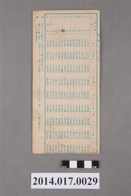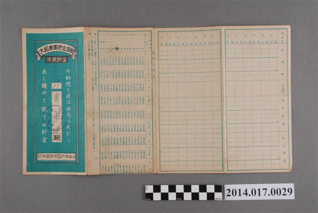 地址載有大庄287番第。本物件為戰爭期間1943年~1945年期間後龍、公司寮、水尾子、二張犁、大山腳、頭湖、崎頂等地人民之銷帳儲金簿,內頁印有大詔奉戴字樣,並以婚葬儀式簡化、宴會遠慮、新謁見合せ、虛禮廢止、節酒節煙、徒步勵行、副業勉強倡導儲金,另外印有儲簿規定如:不許轉讓、改印需申請等,背頁附有複利合計表。大詔指的是1941年對美、英兩國之宣戰詔書,1942年起每個月8日定為大詔奉戴日,為日本政府為太平洋戰爭所運作的國民運動,隨著戰爭規模擴大,戰時有各項國民強迫儲蓄的舉措,以支援前線戰事,1938年日本政府為因應中日戰爭即推行有愛國儲蓄運動,本物件則為1942年後因應戰爭規模擴大後之儲蓄項目,范雅鈞指出本儲金簿為強制存款,直接由薪資扣除。