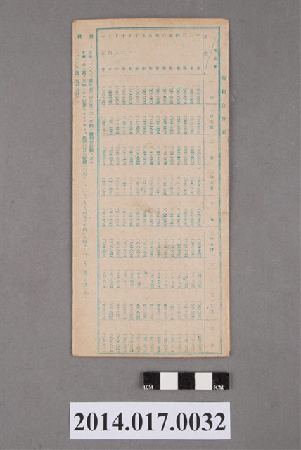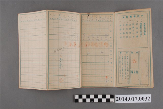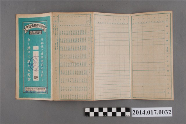 地址載有大庄175。本物件為戰爭期間1943年~1945年期間後龍、公司寮、水尾子、二張犁、大山腳、頭湖、崎頂等地人民之銷帳儲金簿,內頁印有大詔奉戴字樣,並以婚葬儀式簡化、宴會遠慮、新謁見合せ、虛禮廢止、節酒節煙、徒步勵行、副業勉強倡導儲金,另外印有儲簿規定如:不許轉讓、改印需申請等,背頁附有複利合計表。大詔指的是1941年對美、英兩國之宣戰詔書,1942年起每個月8日定為大詔奉戴日,為日本政府為太平洋戰爭所運作的國民運動,隨著戰爭規模擴大,戰時有各項國民強迫儲蓄的舉措,以支援前線戰事,1938年日本政府為因應中日戰爭即推行有愛國儲蓄運動,本物件則為1942年後因應戰爭規模擴大後之儲蓄項目,范雅鈞指出本儲金簿為強制存款,直接由薪資扣除。