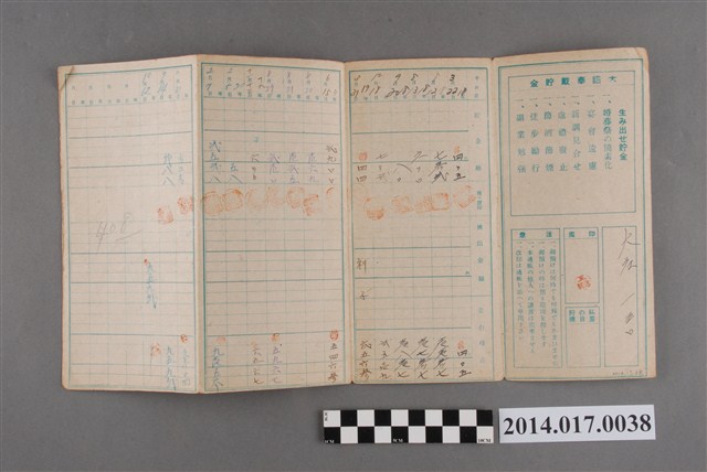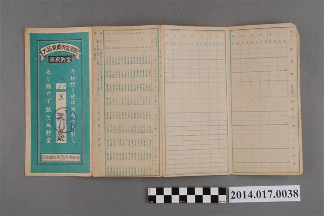地址載有大庄130。本物件為戰爭期間1943年~1945年期間後龍、公司寮、水尾子、二張犁、大山腳、頭湖、崎頂等地人民之銷帳儲金簿,內頁印有大詔奉戴字樣,並以婚葬儀式簡化、宴會遠慮、新謁見合せ、虛禮廢止、節酒節煙、徒步勵行、副業勉強倡導儲金,另外印有儲簿規定如:不許轉讓、改印需申請等,背頁附有複利合計表。大詔指的是1941年對美、英兩國之宣戰詔書,1942年起每個月8日定為大詔奉戴日,為日本政府為太平洋戰爭所運作的國民運動,隨著戰爭規模擴大,戰時有各項國民強迫儲蓄的舉措,以支援前線戰事,1938年日本政府為因應中日戰爭即推行有愛國儲蓄運動,本物件則為1942年後因應戰爭規模擴大後之儲蓄項目,范雅鈞指出本儲金簿為強制存款,直接由薪資扣除。