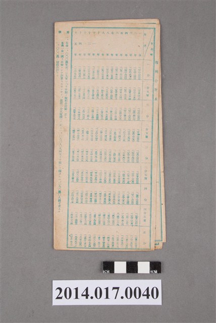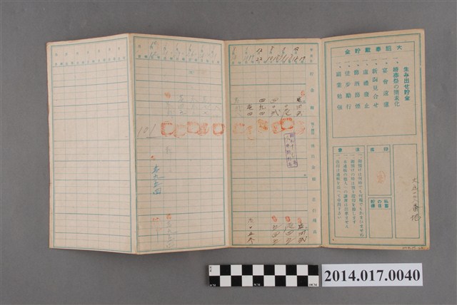 地址處載有大庄238番地。本物件為戰爭期間1943年~1945年期間後龍、公司寮、水尾子、二張犁、大山腳、頭湖、崎頂等地人民之銷帳儲金簿,內頁印有大詔奉戴字樣,並以婚葬儀式簡化、宴會遠慮、新謁見合せ、虛禮廢止、節酒節煙、徒步勵行、副業勉強倡導儲金,另外印有儲簿規定如:不許轉讓、改印需申請等,背頁附有複利合計表。大詔指的是1941年對美、英兩國之宣戰詔書,1942年起每個月8日定為大詔奉戴日,為日本政府為太平洋戰爭所運作的國民運動,隨著戰爭規模擴大,戰時有各項國民強迫儲蓄的舉措,以支援前線戰事,1938年日本政府為因應中日戰爭即推行有愛國儲蓄運動,本物件則為1942年後因應戰爭規模擴大後之儲蓄項目,范雅鈞指出本儲金簿為強制存款,直接由薪資扣除。