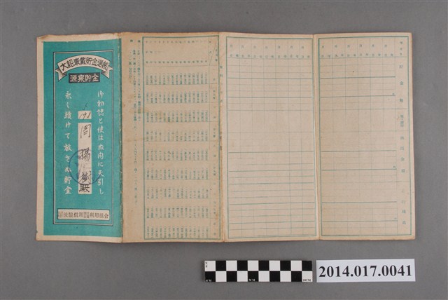 無地址。本物件為戰爭期間1943年~1945年期間後龍、公司寮、水尾子、二張犁、大山腳、頭湖、崎頂等地人民之銷帳儲金簿,內頁印有大詔奉戴字樣,並以婚葬儀式簡化、宴會遠慮、新謁見合せ、虛禮廢止、節酒節煙、徒步勵行、副業勉強倡導儲金,另外印有儲簿規定如:不許轉讓、改印需申請等,背頁附有複利合計表。大詔指的是1941年對美、英兩國之宣戰詔書,1942年起每個月8日定為大詔奉戴日,為日本政府為太平洋戰爭所運作的國民運動,隨著戰爭規模擴大,戰時有各項國民強迫儲蓄的舉措,以支援前線戰事,1938年日本政府為因應中日戰爭即推行有愛國儲蓄運動,本物件則為1942年後因應戰爭規模擴大後之儲蓄項目,范雅鈞指出本儲金簿為強制存款,直接由薪資扣除。