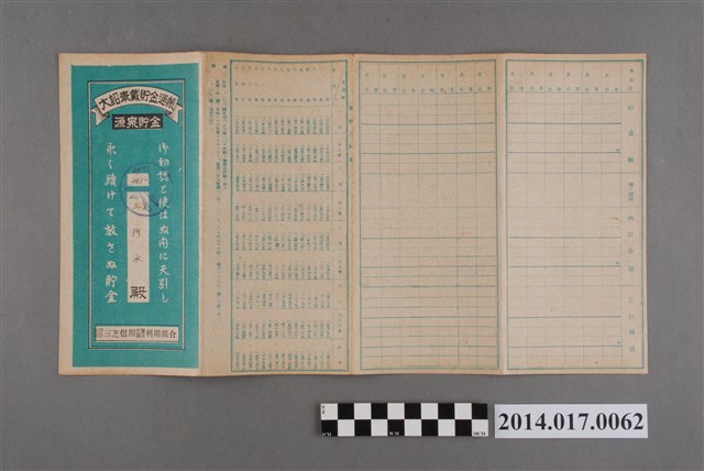 地址載為公司寮78。本物件為戰爭期間1943年~1945年期間後龍、公司寮、水尾子、二張犁、大山腳、頭湖、崎頂等地人民之銷帳儲金簿,內頁印有大詔奉戴字樣,並以婚葬儀式簡化、宴會遠慮、新謁見合せ、虛禮廢止、節酒節煙、徒步勵行、副業勉強倡導儲金,另外印有儲簿規定如:不許轉讓、改印需申請等,背頁附有複利合計表。大詔指的是1941年對美、英兩國之宣戰詔書,1942年起每個月8日定為大詔奉戴日,為日本政府為太平洋戰爭所運作的國民運動,隨著戰爭規模擴大,戰時有各項國民強迫儲蓄的舉措,以支援前線戰事,1938年日本政府為因應中日戰爭即推行有愛國儲蓄運動,本物件則為1942年後因應戰爭規模擴大後之儲蓄項目,范雅鈞指出本儲金簿為強制存款,直接由薪資扣除。