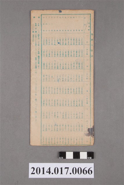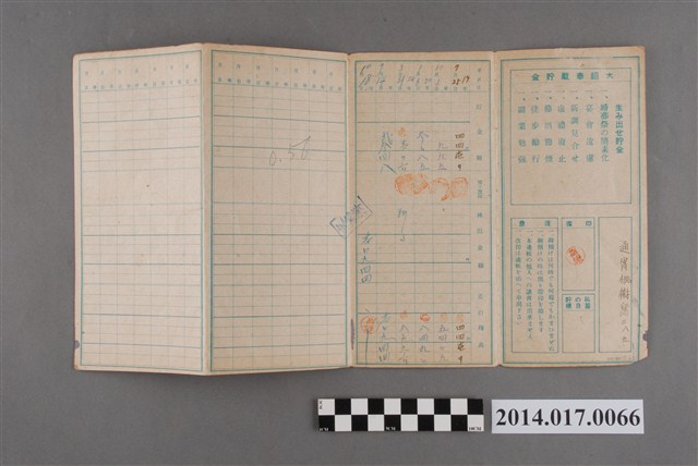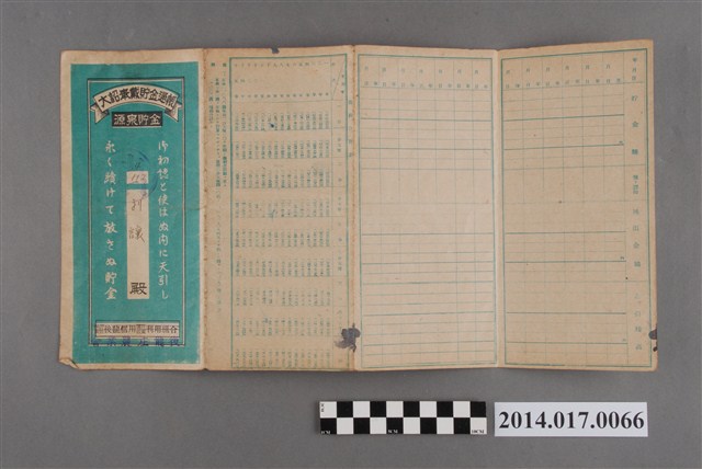 地址載為通宵楓樹窩289。本物件為戰爭期間1943年~1945年期間後龍、公司寮、水尾子、二張犁、大山腳、頭湖、崎頂等地人民之銷帳儲金簿,內頁印有大詔奉戴字樣,並以婚葬儀式簡化、宴會遠慮、新謁見合せ、虛禮廢止、節酒節煙、徒步勵行、副業勉強倡導儲金,另外印有儲簿規定如:不許轉讓、改印需申請等,背頁附有複利合計表。大詔指的是1941年對美、英兩國之宣戰詔書,1942年起每個月8日定為大詔奉戴日,為日本政府為太平洋戰爭所運作的國民運動,隨著戰爭規模擴大,戰時有各項國民強迫儲蓄的舉措,以支援前線戰事,1938年日本政府為因應中日戰爭即推行有愛國儲蓄運動,本物件則為1942年後因應戰爭規模擴大後之儲蓄項目,范雅鈞指出本儲金簿為強制存款,直接由薪資扣除。