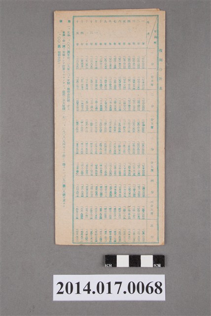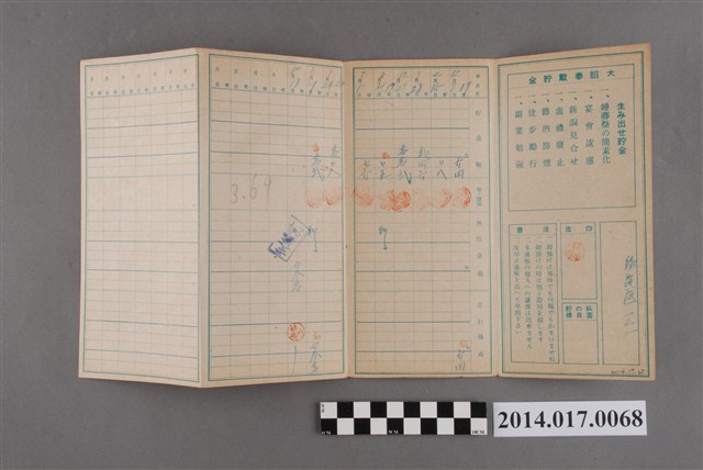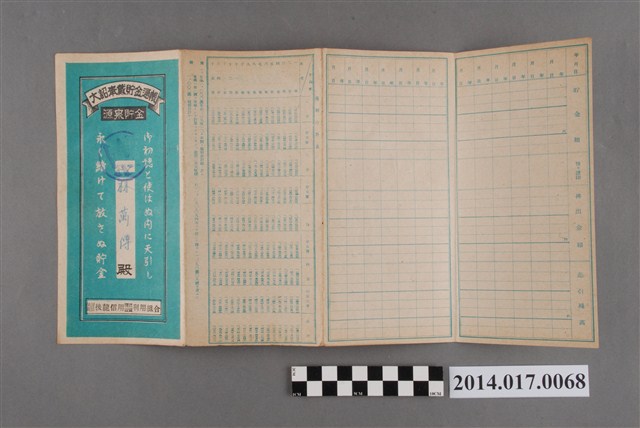 地址載為後龍底121。本物件為戰爭期間1943年~1945年期間後龍、公司寮、水尾子、二張犁、大山腳、頭湖、崎頂等地人民之銷帳儲金簿,內頁印有大詔奉戴字樣,並以婚葬儀式簡化、宴會遠慮、新謁見合せ、虛禮廢止、節酒節煙、徒步勵行、副業勉強倡導儲金,另外印有儲簿規定如:不許轉讓、改印需申請等,背頁附有複利合計表。大詔指的是1941年對美、英兩國之宣戰詔書,1942年起每個月8日定為大詔奉戴日,為日本政府為太平洋戰爭所運作的國民運動,隨著戰爭規模擴大,戰時有各項國民強迫儲蓄的舉措,以支援前線戰事,1938年日本政府為因應中日戰爭即推行有愛國儲蓄運動,本物件則為1942年後因應戰爭規模擴大後之儲蓄項目,范雅鈞指出本儲金簿為強制存款,直接由薪資扣除。