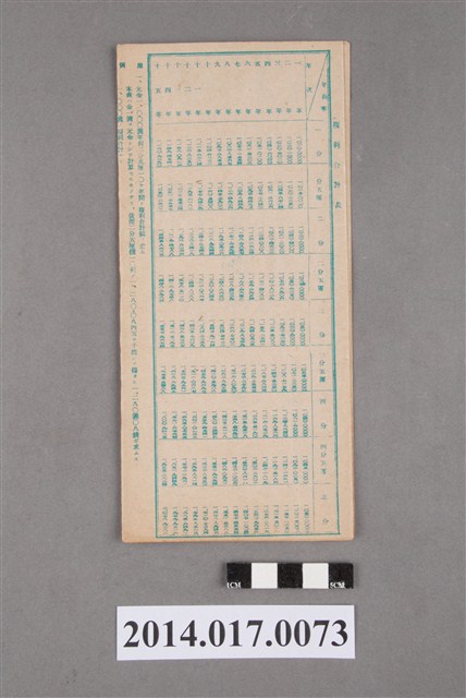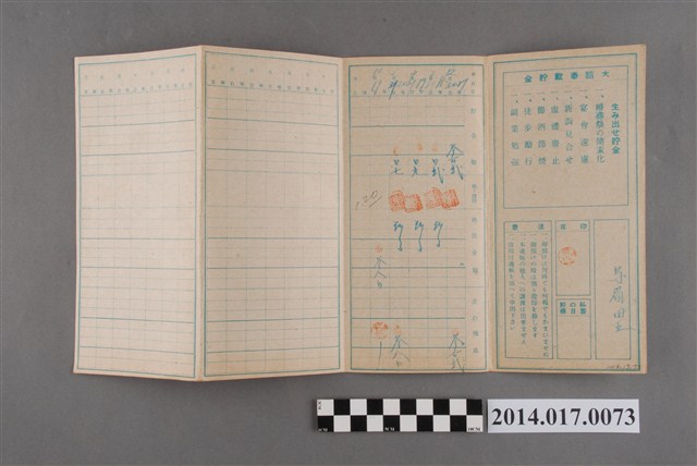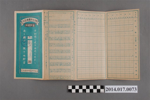 地址載為烏眉45。本物件為戰爭期間1943年~1945年期間後龍、公司寮、水尾子、二張犁、大山腳、頭湖、崎頂等地人民之銷帳儲金簿,內頁印有大詔奉戴字樣,並以婚葬儀式簡化、宴會遠慮、新謁見合せ、虛禮廢止、節酒節煙、徒步勵行、副業勉強倡導儲金,另外印有儲簿規定如:不許轉讓、改印需申請等,背頁附有複利合計表。大詔指的是1941年對美、英兩國之宣戰詔書,1942年起每個月8日定為大詔奉戴日,為日本政府為太平洋戰爭所運作的國民運動,隨著戰爭規模擴大,戰時有各項國民強迫儲蓄的舉措,以支援前線戰事,1938年日本政府為因應中日戰爭即推行有愛國儲蓄運動,本物件則為1942年後因應戰爭規模擴大後之儲蓄項目,范雅鈞指出本儲金簿為強制存款,直接由薪資扣除。