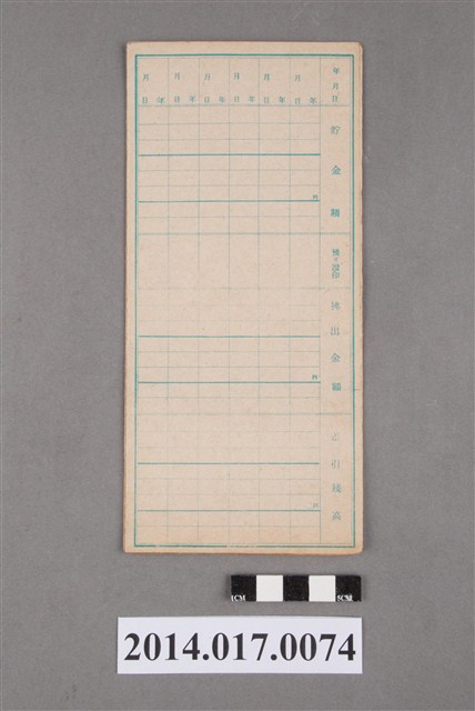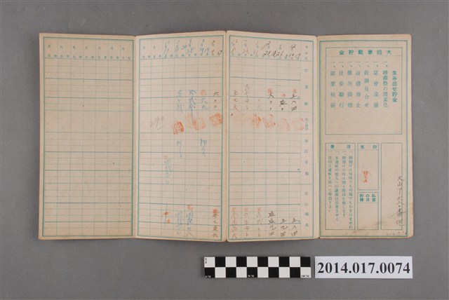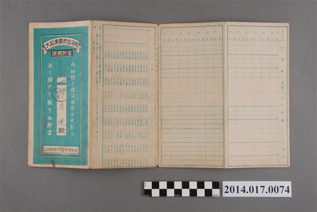 地址載為大山ア680番地。本物件為戰爭期間1943年~1945年期間後龍、公司寮、水尾子、二張犁、大山腳、頭湖、崎頂等地人民之銷帳儲金簿,內頁印有大詔奉戴字樣,並以婚葬儀式簡化、宴會遠慮、新謁見合せ、虛禮廢止、節酒節煙、徒步勵行、副業勉強倡導儲金,另外印有儲簿規定如:不許轉讓、改印需申請等,背頁附有複利合計表。大詔指的是1941年對美、英兩國之宣戰詔書,1942年起每個月8日定為大詔奉戴日,為日本政府為太平洋戰爭所運作的國民運動,隨著戰爭規模擴大,戰時有各項國民強迫儲蓄的舉措,以支援前線戰事,1938年日本政府為因應中日戰爭即推行有愛國儲蓄運動,本物件則為1942年後因應戰爭規模擴大後之儲蓄項目,范雅鈞指出本儲金簿為強制存款,直接由薪資扣除。