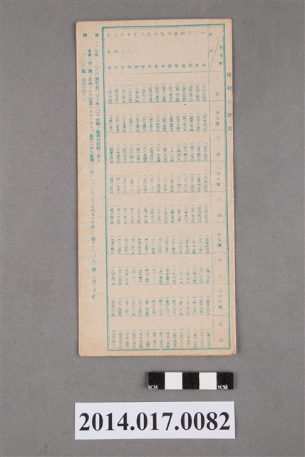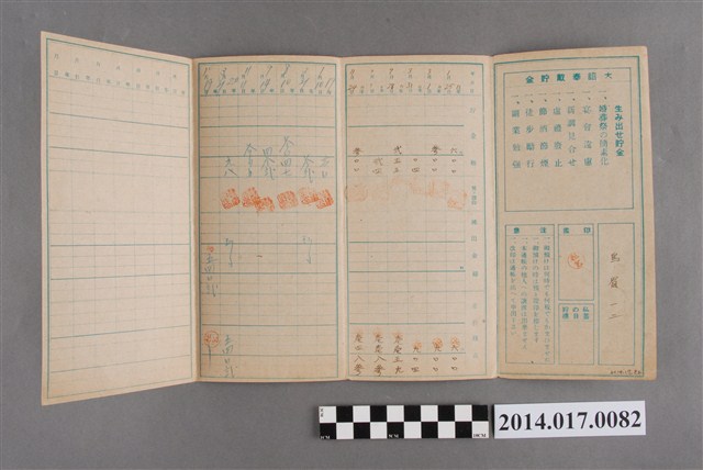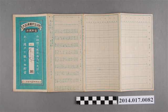 地址登載為烏眉12。本物件為戰爭期間1943年~1945年期間後龍、公司寮、水尾子、二張犁、大山腳、頭湖、崎頂等地人民之銷帳儲金簿,內頁印有大詔奉戴字樣,並以婚葬儀式簡化、宴會遠慮、新謁見合せ、虛禮廢止、節酒節煙、徒步勵行、副業勉強倡導儲金,另外印有儲簿規定如:不許轉讓、改印需申請等,背頁附有複利合計表。大詔指的是1941年對美、英兩國之宣戰詔書,1942年起每個月8日定為大詔奉戴日,為日本政府為太平洋戰爭所運作的國民運動,隨著戰爭規模擴大,戰時有各項國民強迫儲蓄的舉措,以支援前線戰事,1938年日本政府為因應中日戰爭即推行有愛國儲蓄運動,本物件則為1942年後因應戰爭規模擴大後之儲蓄項目,范雅鈞指出本儲金簿為強制存款,直接由薪資扣除。