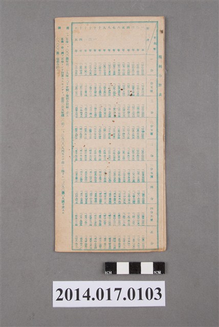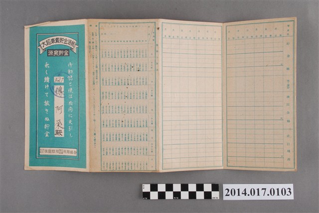 本物件為戰爭期間1943年~1945年期間後龍、公司寮、水尾子、二張犁、大山腳、頭湖、崎頂等地人民之銷帳儲金簿,內頁印有大詔奉戴字樣,並以婚葬儀式簡化、宴會遠慮、新謁見合せ、虛禮廢止、節酒節煙、徒步勵行、副業勉強倡導儲金,另外印有儲簿規定如:不許轉讓、改印需申請等,背頁附有複利合計表。大詔指的是1941年對美、英兩國之宣戰詔書,1942年起每個月8日定為大詔奉戴日,為日本政府為太平洋戰爭所運作的國民運動,隨著戰爭規模擴大,戰時有各項國民強迫儲蓄的舉措,以支援前線戰事,1938年日本政府為因應中日戰爭即推行有愛國儲蓄運動,本物件則為1942年後因應戰爭規模擴大後之儲蓄項目,范雅鈞指出本儲金簿為強制存款,直接由薪資扣除。