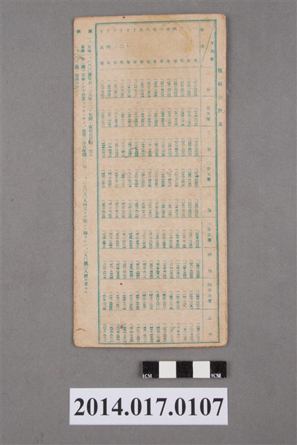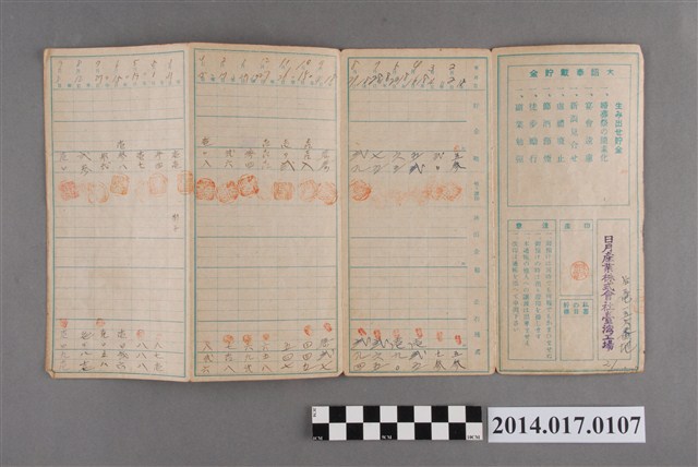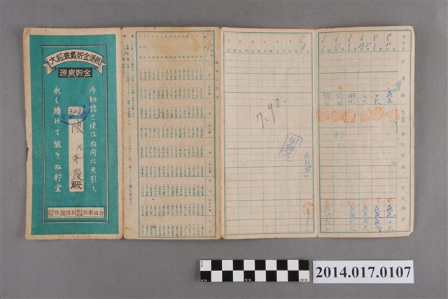 地址載為後龍156番地,並印有日月產業株式會社臺灣工場字樣。本物件為戰爭期間1943年~1945年期間後龍、公司寮、水尾子、二張犁、大山腳、頭湖、崎頂等地人民之銷帳儲金簿,內頁印有大詔奉戴字樣,並以婚葬儀式簡化、宴會遠慮、新謁見合せ、虛禮廢止、節酒節煙、徒步勵行、副業勉強倡導儲金,另外印有儲簿規定如:不許轉讓、改印需申請等,背頁附有複利合計表。大詔指的是1941年對美、英兩國之宣戰詔書,1942年起每個月8日定為大詔奉戴日,為日本政府為太平洋戰爭所運作的國民運動,隨著戰爭規模擴大,戰時有各項國民強迫儲蓄的舉措,以支援前線戰事,1938年日本政府為因應中日戰爭即推行有愛國儲蓄運動,本物件則為1942年後因應戰爭規模擴大後之儲蓄項目,范雅鈞指出本儲金簿為強制存款,直接由薪資扣除。