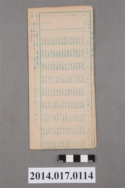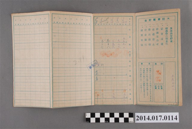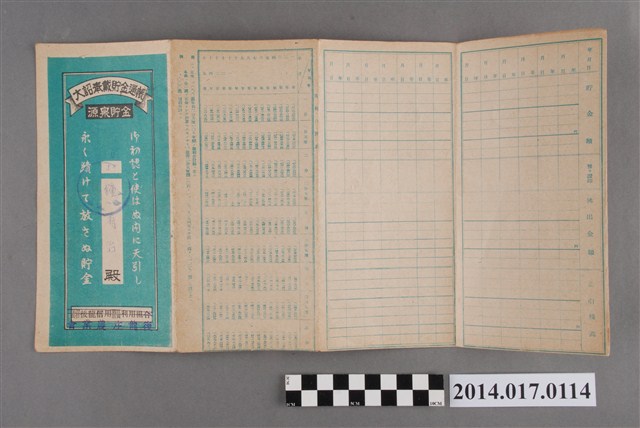 地址載為水尾子47。本物件為戰爭期間1943年~1945年期間後龍、公司寮、水尾子、二張犁、大山腳、頭湖、崎頂等地人民之銷帳儲金簿,內頁印有大詔奉戴字樣,並以婚葬儀式簡化、宴會遠慮、新謁見合せ、虛禮廢止、節酒節煙、徒步勵行、副業勉強倡導儲金,另外印有儲簿規定如:不許轉讓、改印需申請等,背頁附有複利合計表。大詔指的是1941年對美、英兩國之宣戰詔書,1942年起每個月8日定為大詔奉戴日,為日本政府為太平洋戰爭所運作的國民運動,隨著戰爭規模擴大,戰時有各項國民強迫儲蓄的舉措,以支援前線戰事,1938年日本政府為因應中日戰爭即推行有愛國儲蓄運動,本物件則為1942年後因應戰爭規模擴大後之儲蓄項目,范雅鈞指出本儲金簿為強制存款,直接由薪資扣除。