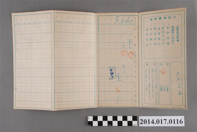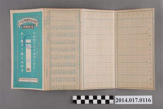 地址載為大庄175。本物件為戰爭期間1943年~1945年期間後龍、公司寮、水尾子、二張犁、大山腳、頭湖、崎頂等地人民之銷帳儲金簿,內頁印有大詔奉戴字樣,並以婚葬儀式簡化、宴會遠慮、新謁見合せ、虛禮廢止、節酒節煙、徒步勵行、副業勉強倡導儲金,另外印有儲簿規定如:不許轉讓、改印需申請等,背頁附有複利合計表。大詔指的是1941年對美、英兩國之宣戰詔書,1942年起每個月8日定為大詔奉戴日,為日本政府為太平洋戰爭所運作的國民運動,隨著戰爭規模擴大,戰時有各項國民強迫儲蓄的舉措,以支援前線戰事,1938年日本政府為因應中日戰爭即推行有愛國儲蓄運動,本物件則為1942年後因應戰爭規模擴大後之儲蓄項目,范雅鈞指出本儲金簿為強制存款,直接由薪資扣除。