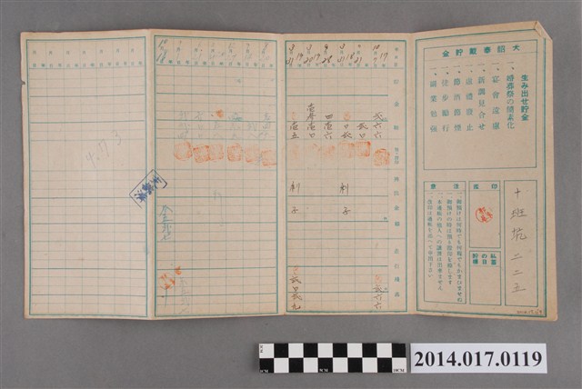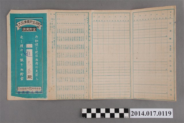 地址載為十班坑225。本物件為戰爭期間1943年~1945年期間後龍、公司寮、水尾子、二張犁、大山腳、頭湖、崎頂等地人民之銷帳儲金簿,內頁印有大詔奉戴字樣,並以婚葬儀式簡化、宴會遠慮、新謁見合せ、虛禮廢止、節酒節煙、徒步勵行、副業勉強倡導儲金,另外印有儲簿規定如:不許轉讓、改印需申請等,背頁附有複利合計表。大詔指的是1941年對美、英兩國之宣戰詔書,1942年起每個月8日定為大詔奉戴日,為日本政府為太平洋戰爭所運作的國民運動,隨著戰爭規模擴大,戰時有各項國民強迫儲蓄的舉措,以支援前線戰事,1938年日本政府為因應中日戰爭即推行有愛國儲蓄運動,本物件則為1942年後因應戰爭規模擴大後之儲蓄項目,范雅鈞指出本儲金簿為強制存款,直接由薪資扣除。